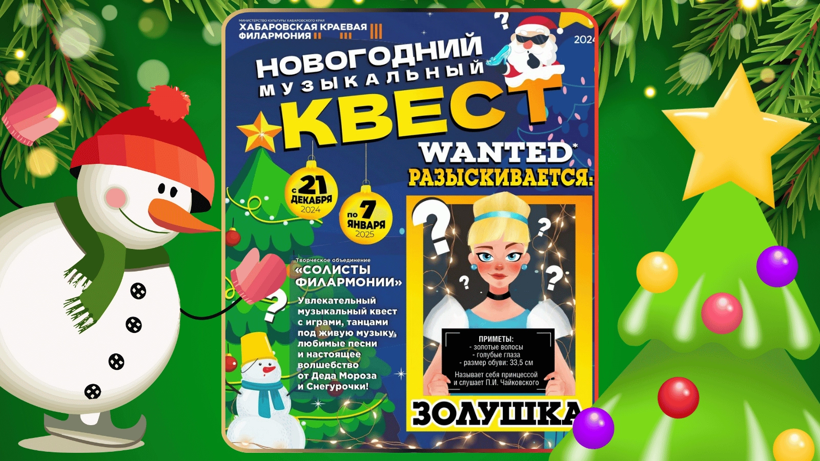 Новогодний музыкальный квест. Разыскивается: Золушка ХабаровскХабаровский крайс 21 декабря 2024 по 7 января 2025 О мероприятии Информация